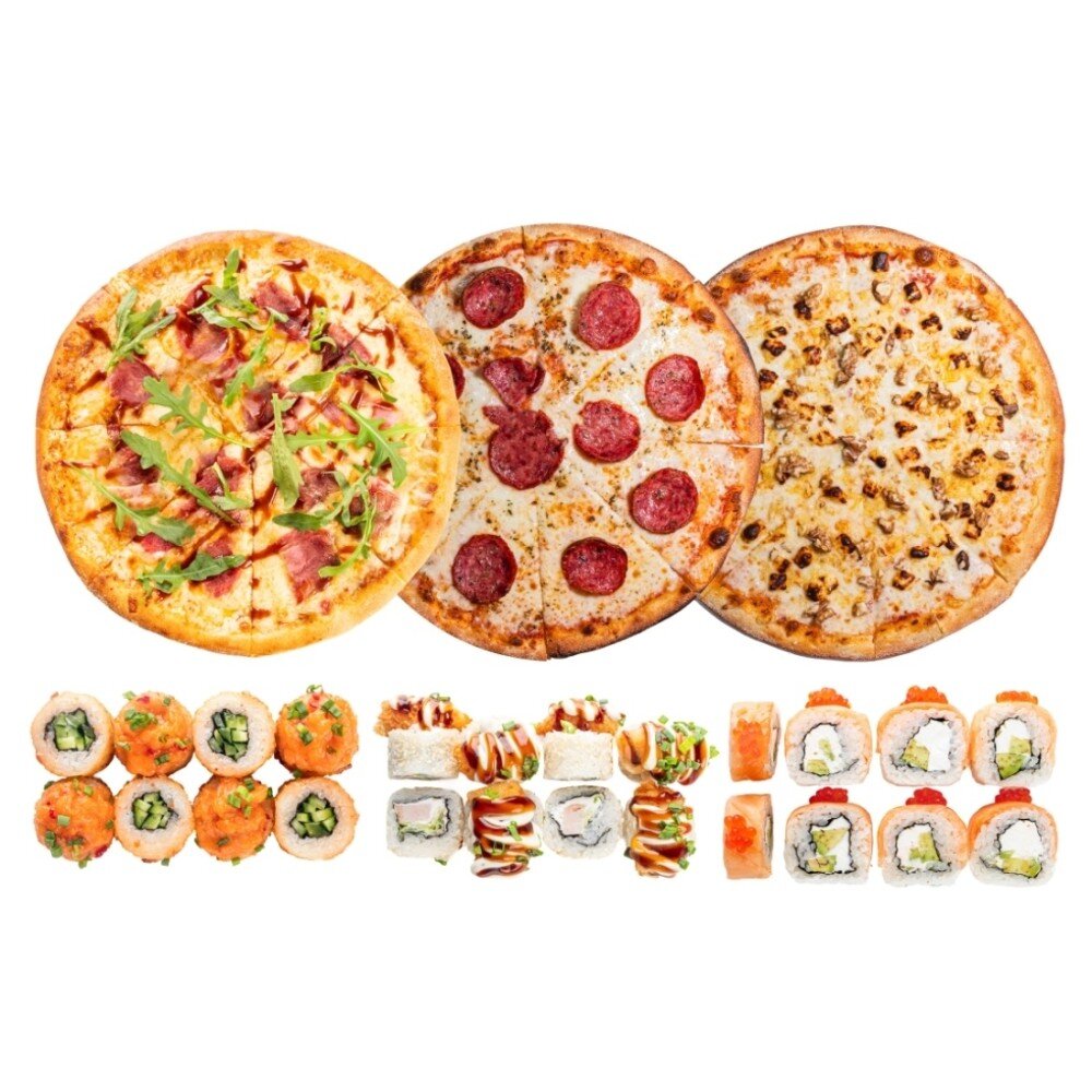 Пицца Чикен ВВQ Пицца Пепперони, Пицца Сыр Ассорти, Ролл Фреш, Ролл Рио темпура, Ролл Филадельфия