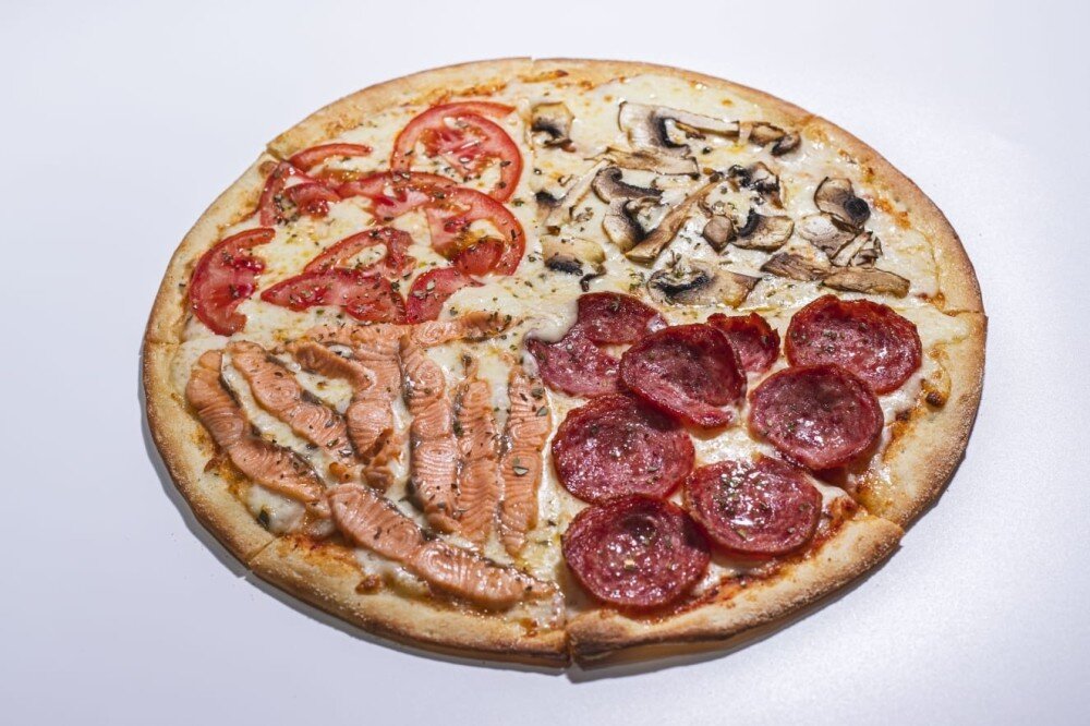 Томатный соус, моцарелла, шампиньоны, помидоры, говяжья колбаса, семга, орегано