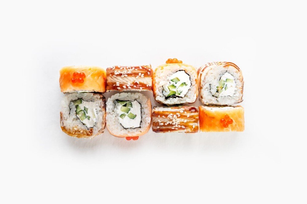 Рис, нори, крем-чиз, угорь, семга, огурцы, кунжут, унаги