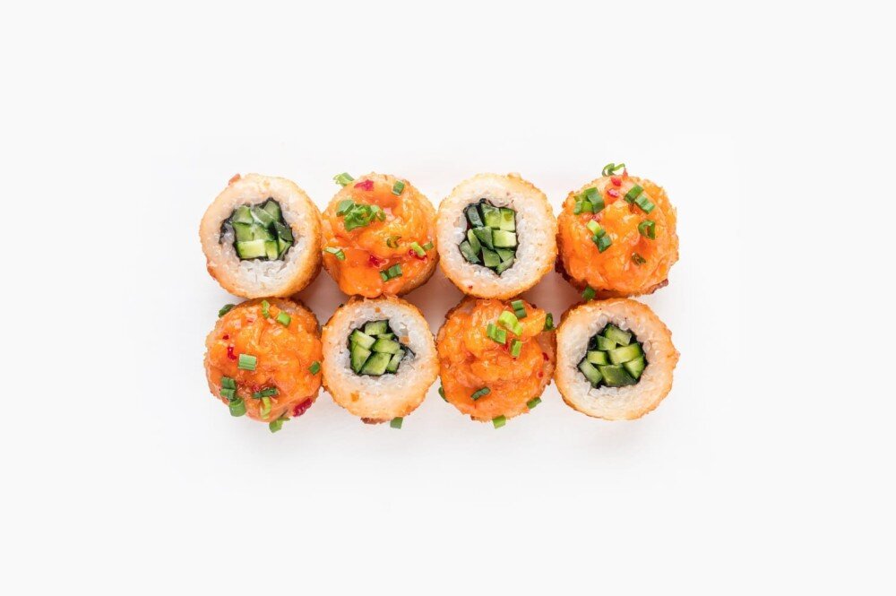 Рис, нори, крем-чиз, огурцы, фреш соус, чили соус, кляр, панко