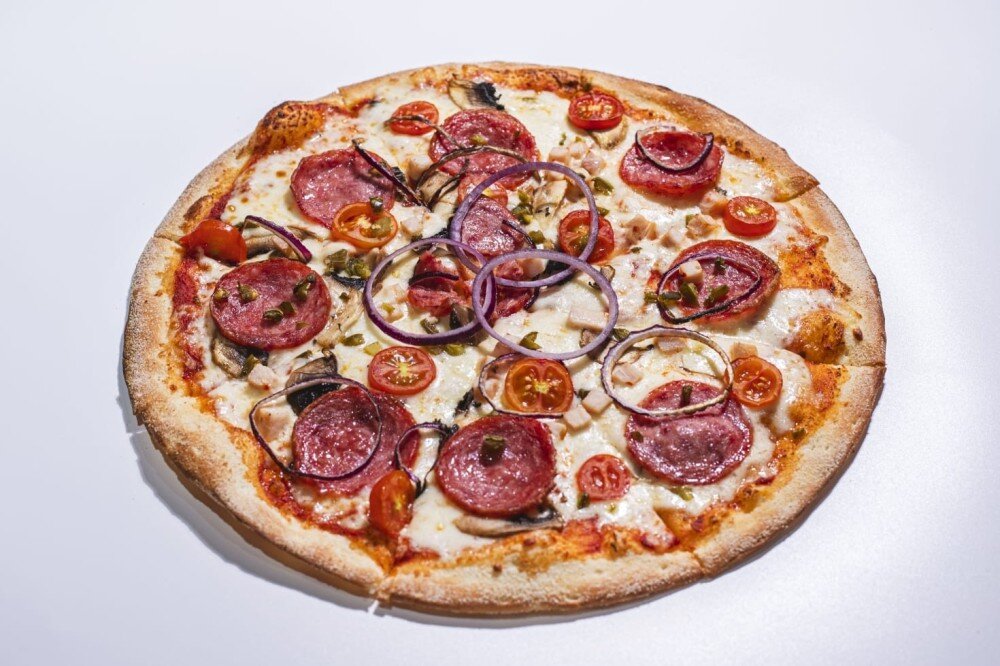 Томатный соус, моцарелла, шампиньоны, черри, говяжья колбаса, куриное филе, красный лук, халапеньо, орегано.