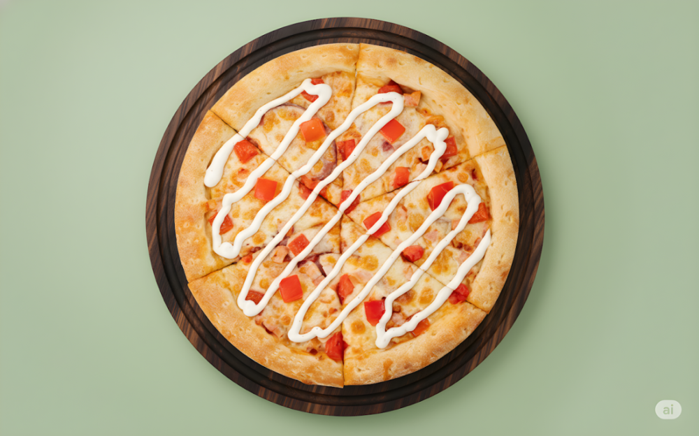 Томатный соус, моцарелла, ветчина из говядины, курица, помидор, ранч соус.