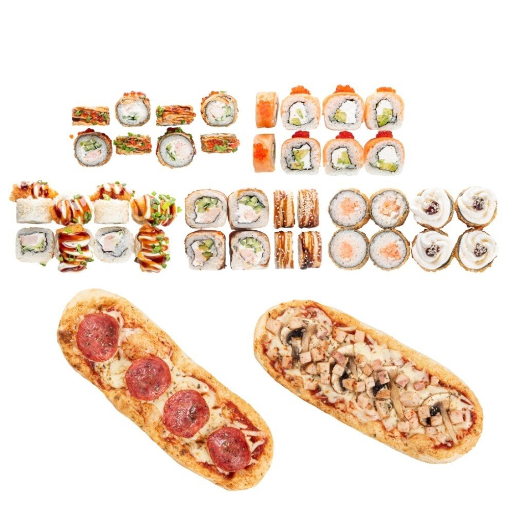 Ролл Филадельфия, Ролл Канада, Ролл Ойси, Ролл Сэке темпура, Ролл с креветками + 2 мини пиццы курица с грибами и пепперони